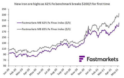 The past year has been an unusual one on the iron ore market. The price of iron ore was heavily impacted by the spread of the COVID-19 pandemic as demand for steel fluctuated. The price of iron ore fell at first, only to rebound during the second half of the year to levels that have not been seen since the peak years 2010–2013. During the first quarter, the price trend continued to climb, and the average price for the quarter was USD 167/tonne, which was significantly higher than the previous quarter.
