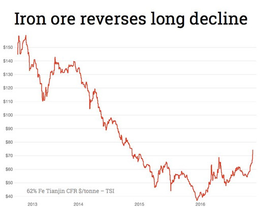 The iron ore market price for 62%Fe iron ore has made a major surge again to well over $70/t (See figure below).