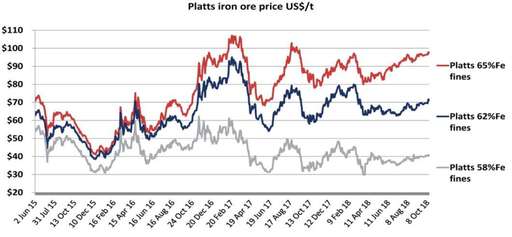 The world market price for 62% iron ore has exceeded 70 dollars per tonne while the price for 65% ore has risen to closer to 100 dollars per tonne (see the graph below).