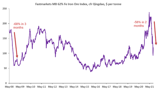 During the third quarter, we experienced what must be described as a collapse for the price of iron ore. The main reason for this has probably been the stops for steel production that the Chinese government introduced in an attempt to avoid a crude steel production for the whole of 2021 that exceeds the record level of 2020, achieve environmental goals and at the same time try to push down iron ore prices. During the first months of the year, Chinese steel production was initially about 12% higher than the year before, despite a first round of production cuts demanded by the government. The cuts in the second half of the year therefore needed to be strong to affect the market. The result was the fastest depreciation of iron ore since 2008. See graph below.