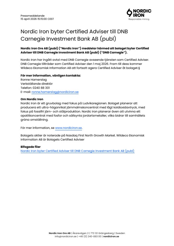 Nordic Iron har ingått avtal med DNB Carnegie avseende tjänsten som Certified Adviser. DNB Carnegie tillträder som Certified Adviser den 1 maj 2026. Fram till dess kommer Wildeco Ekonomisk Information AB att fortsatt agera Certified Adviser åt bolaget.§
