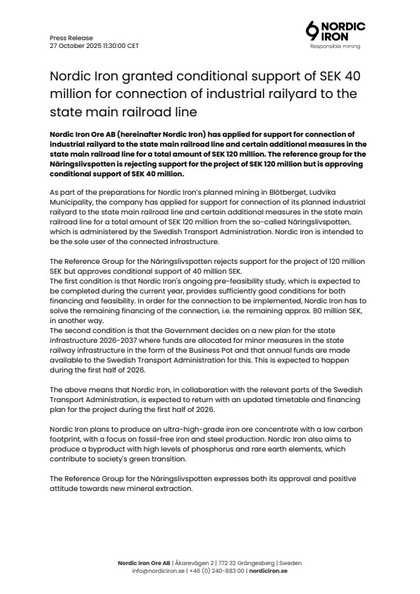 The above means that Nordic Iron, in collaboration with the relevant parts of the Swedish Transport Administration, is expected to return with an updated timetable and financing plan for the project during the first half of 2026.