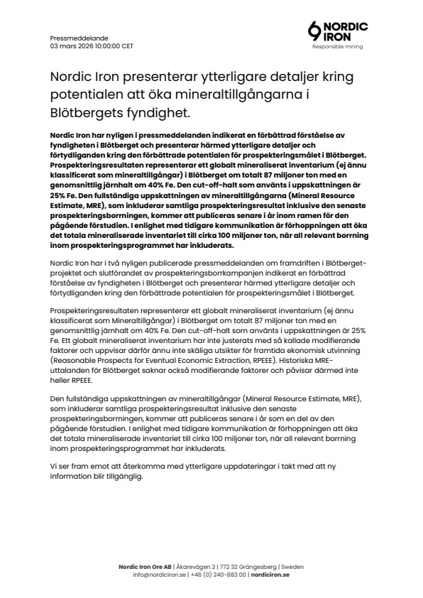Nordic Iron har nyligen i pressmeddelanden indikerat en förbättrad förståelse av fyndigheten i Blötberget och presenterar härmed ytterligare detaljer och förtydliganden kring den förbättrade potentialen för prospekteringsmålet i Blötberget. Prospekteringsresultaten representerar ett globalt mineraliserat inventarium (ej ännu klassificerat som mineraltillgångar) i Blötberget om totalt 87 miljoner ton med en genomsnittlig järnhalt om 40% Fe. Den cut-off-halt som använts i uppskattningen är 25% Fe. Den fullständiga uppskattningen av mineraltillgångarna (Mineral Resource Estimate, MRE), som inkluderar samtliga prospekteringsresultat inklusive den senaste prospekteringsborrningen, kommer att publiceras senare i år inom ramen för den pågående förstudien. I enlighet med tidigare kommunikation är förhoppningen att öka det totala mineraliserade inventariet till cirka 100 miljoner ton, när all relevant borrning inom prospekteringsprogrammet har inkluderats.