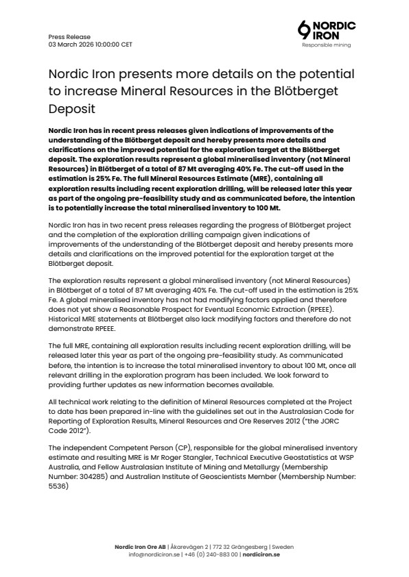 Nordic Iron has in recent press releases given indications of improvements of the understanding of the Blötberget deposit and hereby presents more details and clarifications on the improved potential for the exploration target at the Blötberget deposit. The exploration results represent a global mineralised inventory (not Mineral Resources) in Blötberget of a total of 87 Mt averaging 40% Fe. The cut-off used in the estimation is 25% Fe. The full Mineral Resources Estimate (MRE), containing all exploration results including recent exploration drilling, will be released later this year as part of the ongoing pre-feasibility study and as communicated before, the intention is to potentially increase the total mineralised inventory to 100 Mt.