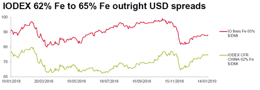 The falls in the iron ore prices towards the end of 2018 were a bit of a correction, but as expected, the rebound started quickly and the iron ore price is steadily rising on the basis of the long-term demands, from China, stockpiling. This has seen the main bulk IODEX62%Fe climb back to around $76/t and the higher quality 65%Fe indices has climbed back to around $90/t. This is about the levels expected for 2019 by some of the analysts. The differential between the standard 62%Fe and the premium for the 65%IODEX has slipped quite a bit and the differential has fallen to around $5/t/1%Fe, close to half the peak. This is more in line with the anticipated average over the medium to longer term.
