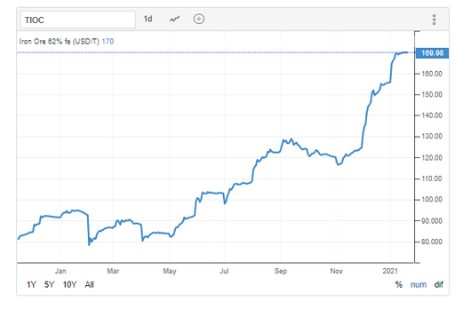 It is never easy to predict the market. At the start of the year, we witnessed a sharp drop in prices due to the outbreak of the coronavirus. Problems like these will naturally pass, but that the market would swing so quickly to a sharp price increase was a pleasant surprise. The price for ore with 62% iron content went down during the spring but then showed strength during the remainder of the year. China emerged from its recession early, but there were some problems with deliveries from Brazil and Australia. The price development in China for ore with 62% iron content is presented below: